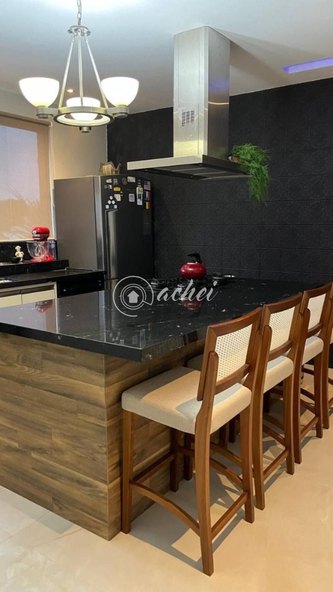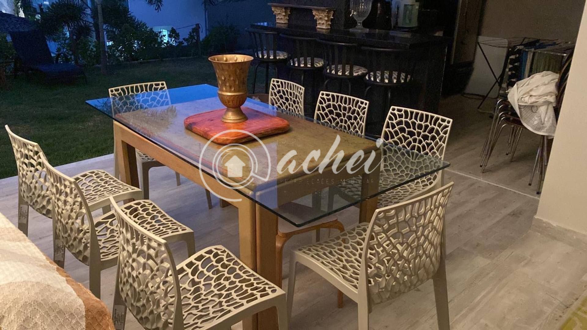 No pavimento térreo, o imóvel conta com 02 salas de estar e jantar integradas, 01 quarto de visita com suíte, lavabo, 04 suítes no total, e 06 banheiros distribuídos por toda a casa. A cozinha principal possui armários planejados, ilha com cooktop e cadeiras, além de uma cozinha de apoio com segunda pia, armários e despensa.