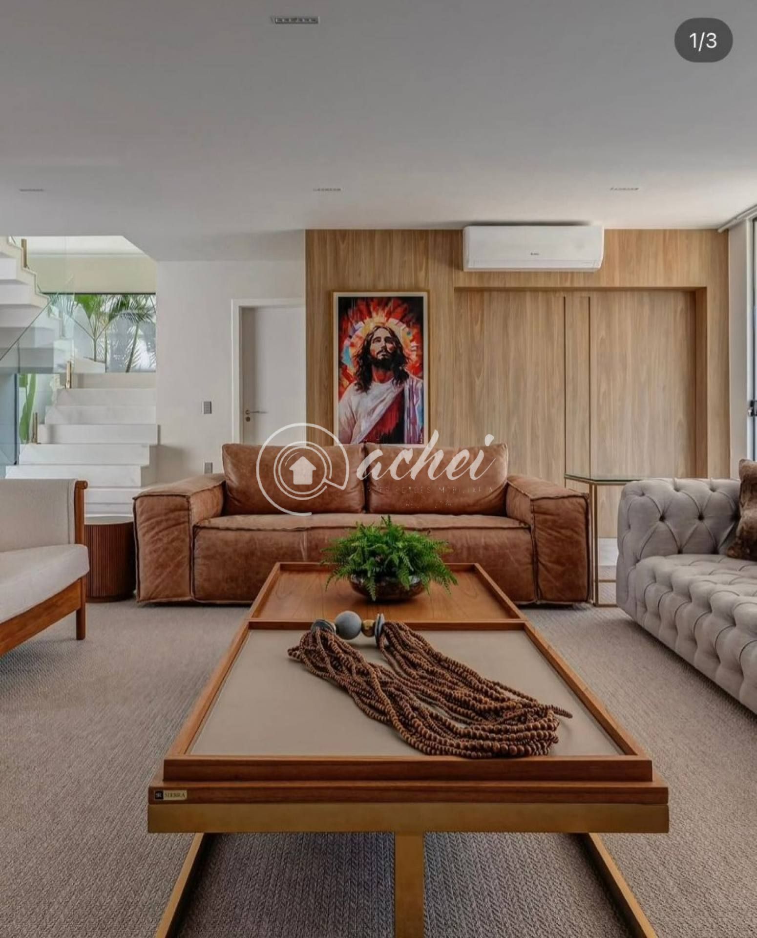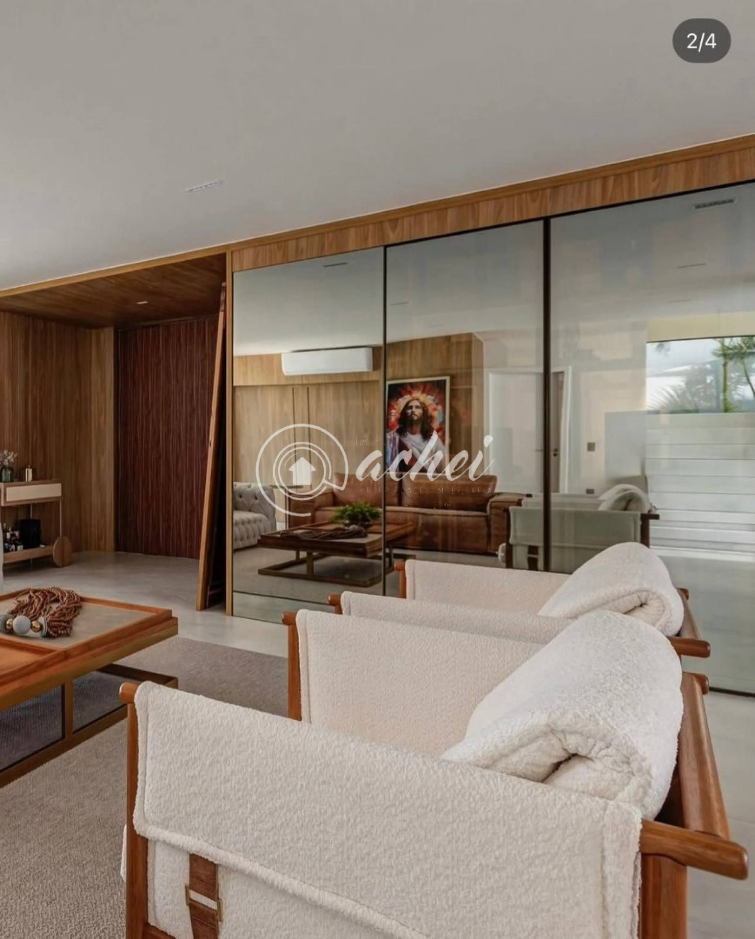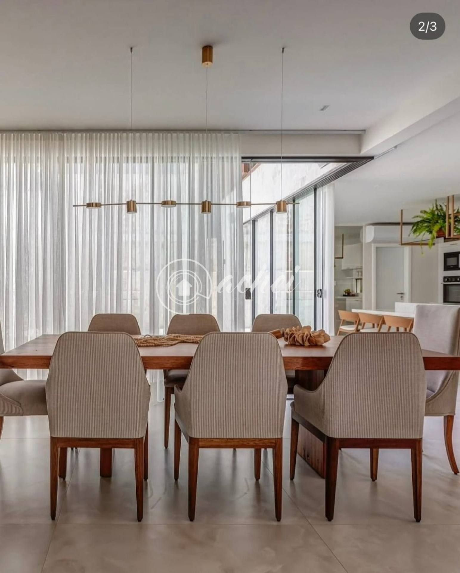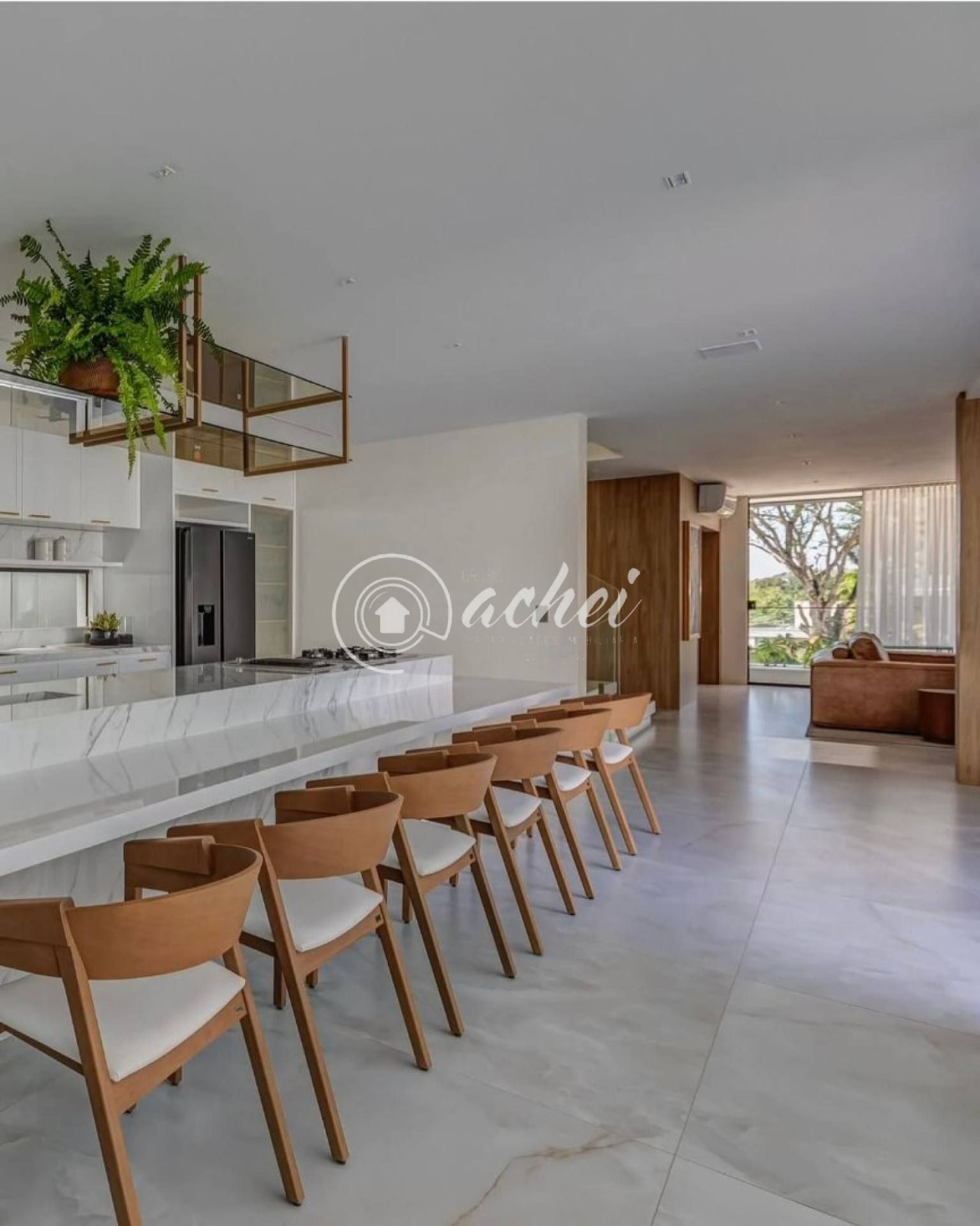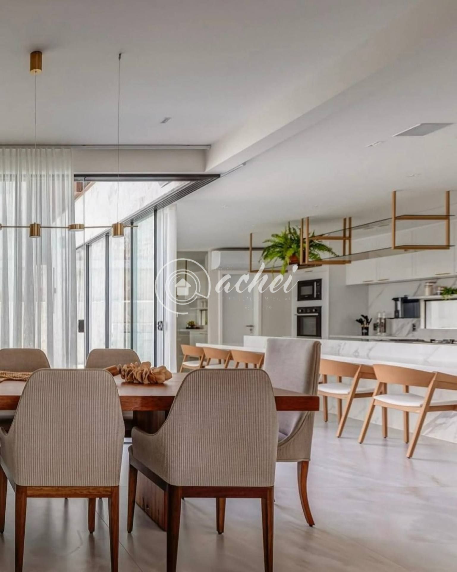 As salas de estar e jantar, amplas e elegantes, são mobiliadas com peças Sierra, criando um ambiente acolhedor e sofisticado. A residência dispõe ainda de uma adega equipada com capacidade para mais de 200 garrafas, além de uma cozinha gourmet com ilha planejada por BF Móveis e Sierra, equipada com cooktop e grelha Elettromec. Para maior funcionalidade, o imóvel conta também com sala de TV/Home Office e lavabo social.