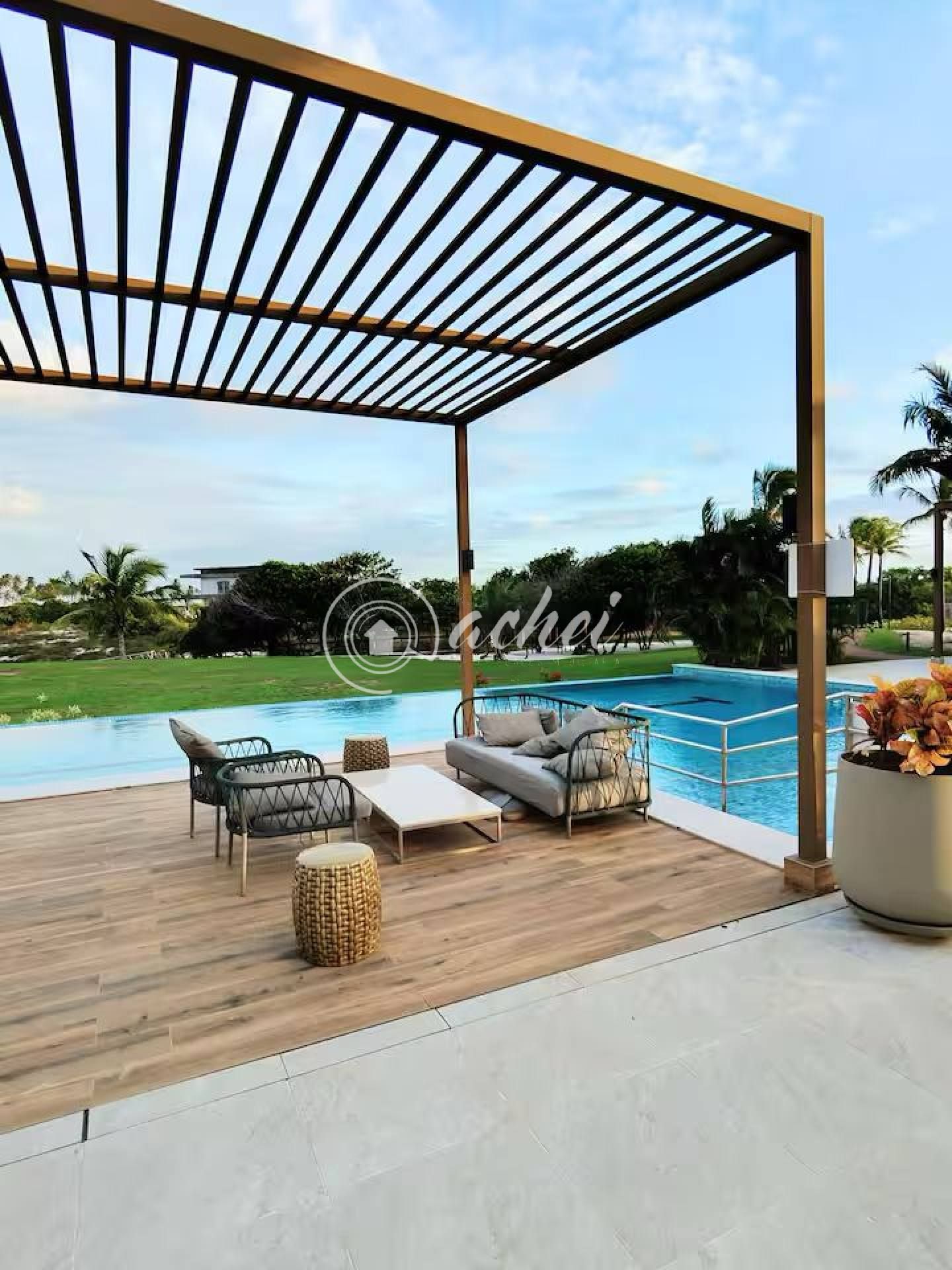 Pergolado em eucalipto com cobertura em policarbonato e palhinha