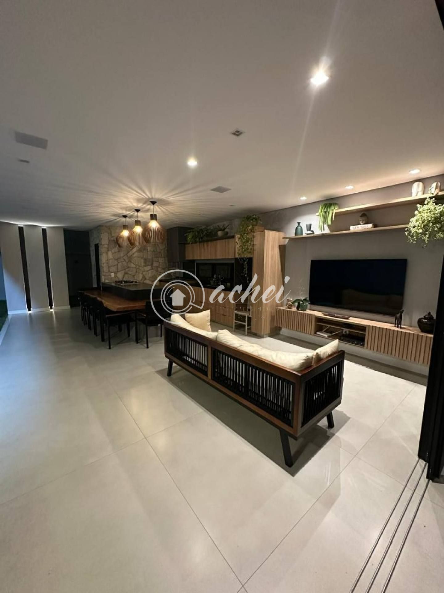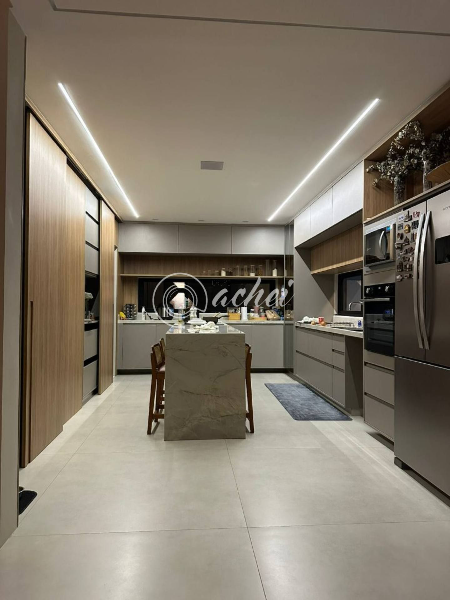 A área social impressiona com sala ampla e pé-direito duplo, trazendo luminosidade e sensação de amplitude, integrada a uma cozinha moderna e totalmente equipada, com ilha central, armários planejados e cristaleira, ideal para quem valoriza funcionalidade e design.