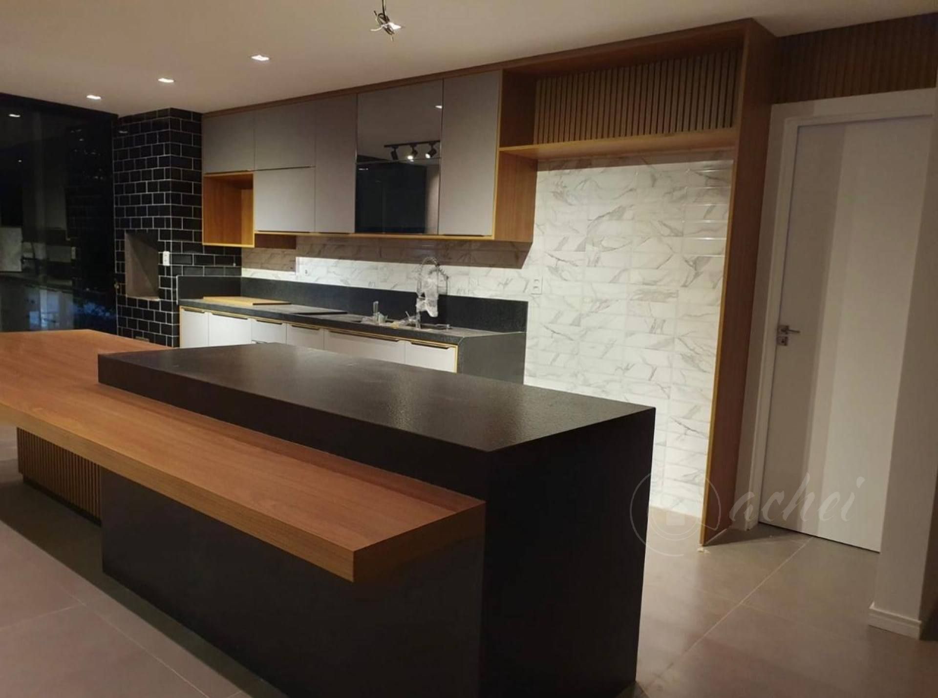 A área social se destaca pela sala principal com pé-direito duplo, proporcionando imponência e iluminação natural, além de uma segunda sala integrada à cozinha. A cozinha é um dos grandes diferenciais, com ilha central e mesa de 4 metros, ideal para convivência e momentos em família, contando ainda com despensa de apoio.